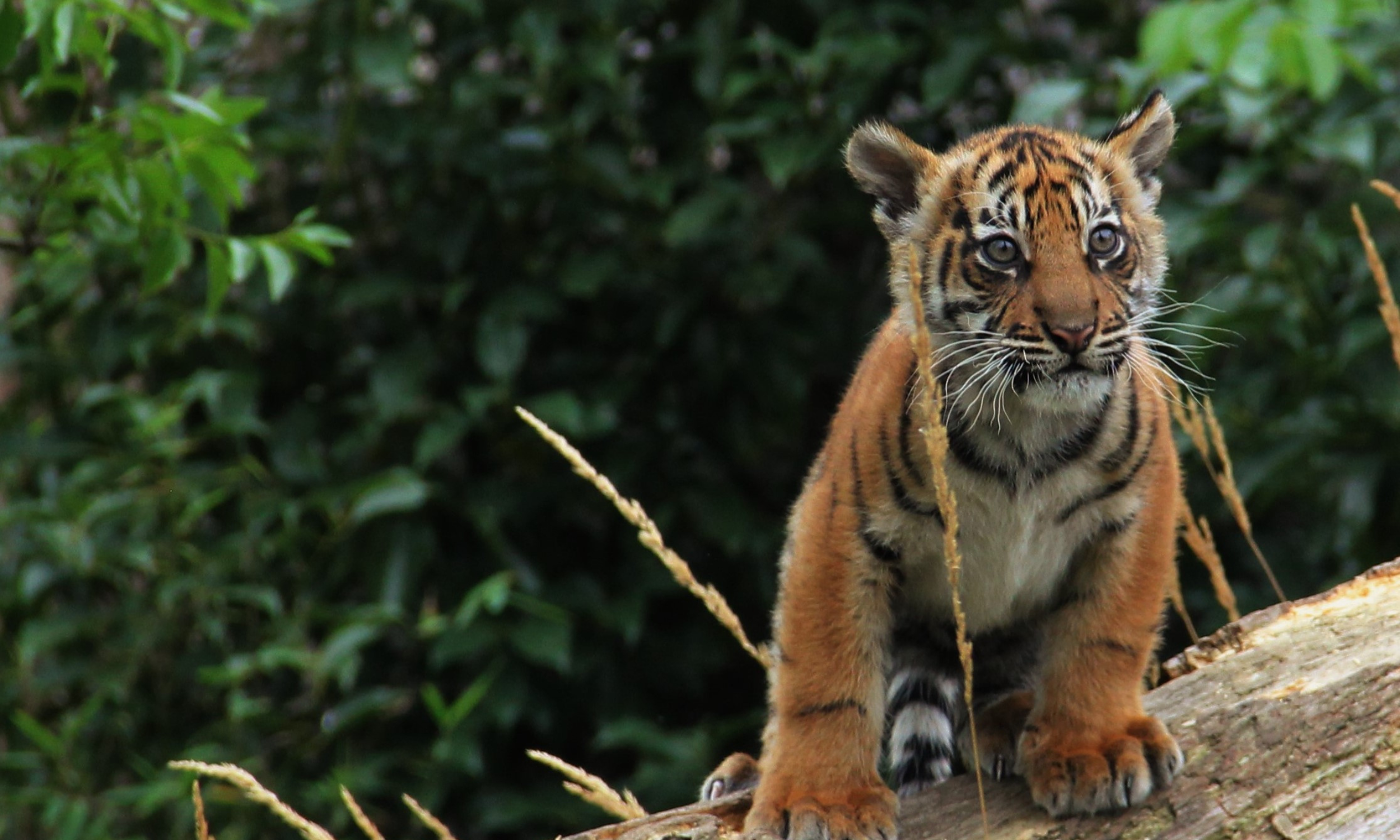A tiger resting on a tree stump in a forest.